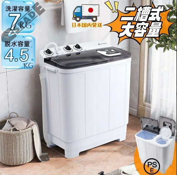 - 【国内発送】二槽式洗濯機 縦型洗濯機 洗濯7kg/脱水槽4.5kg 大容量 タイマー機能付き コンパクト 小型洗濯機 節電 二槽式洗濯機