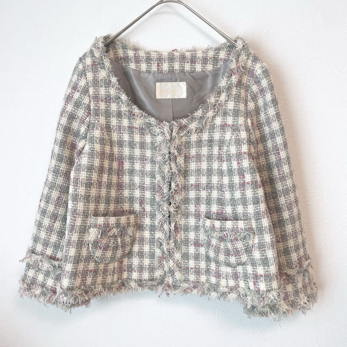- ピンキーガールズラックスpinky girls LUXポコポコツイード7分袖ノーカラー ショート ジャケット アウター白ホワイト紫パープルSサイズ