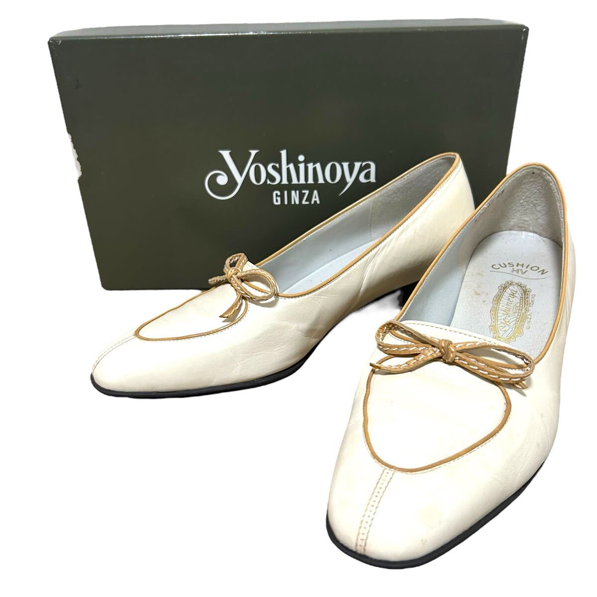 - 【箱付き】銀座ヨシノヤ レザーヒールローファー リボン ホワイト 日本製 23cm