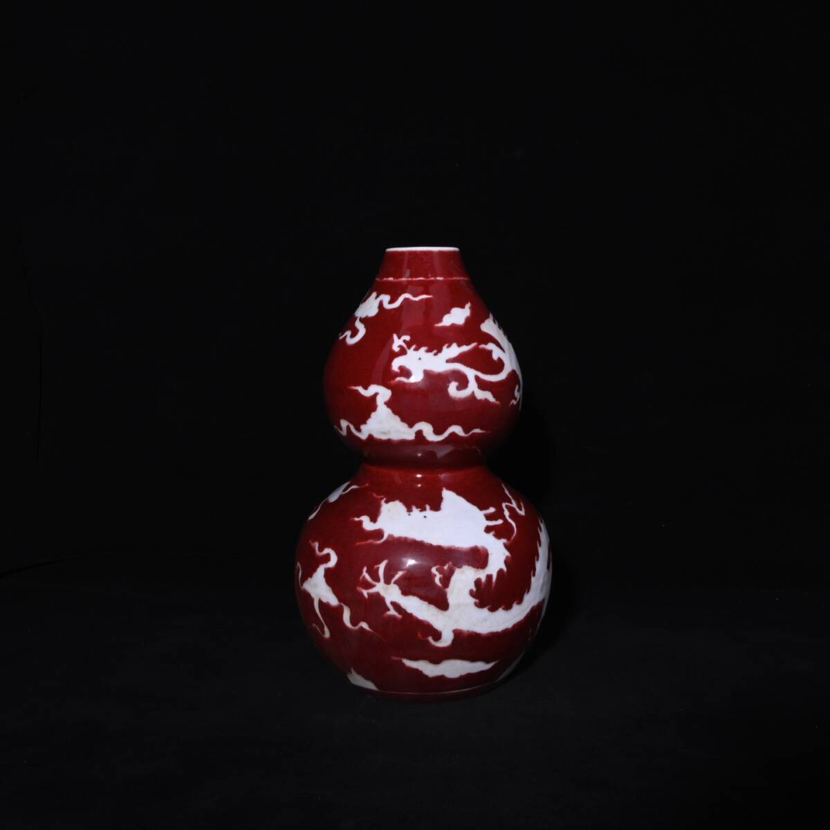 > 9+GV9198「東洋美術」 中国骨董 人間国宝 磁器製品【龍と鳳凰の模様が彫られた赤釉瓢箪花瓶】 旧物 孤品 珍品 陶磁器 収蔵価値が高い