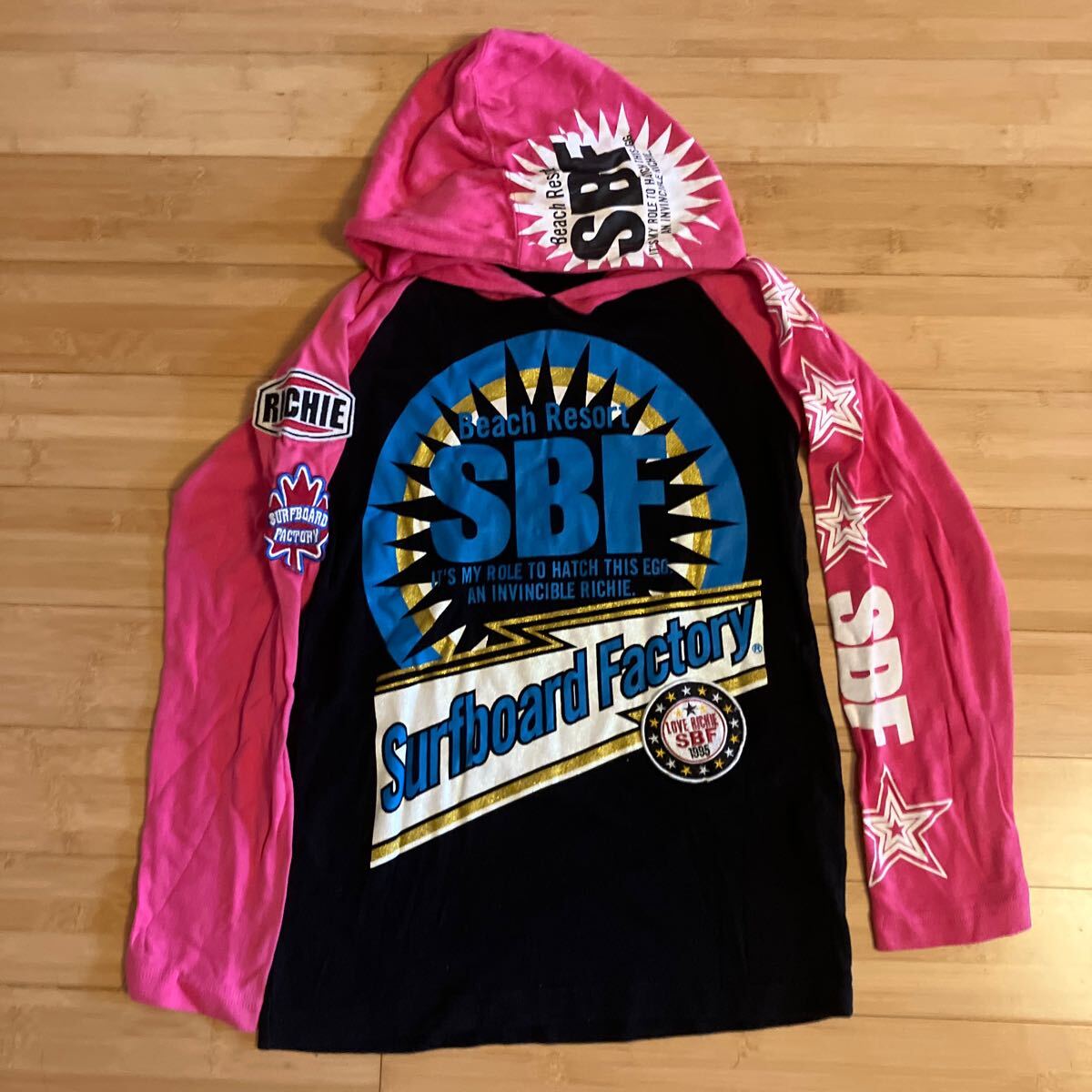- アメカジ ロンT 当時物 長袖Tシャツ MサイズLOVE RICHIE SURFBOHRD FHCTORY ブラック ピンク ロングTシャツ フード付き