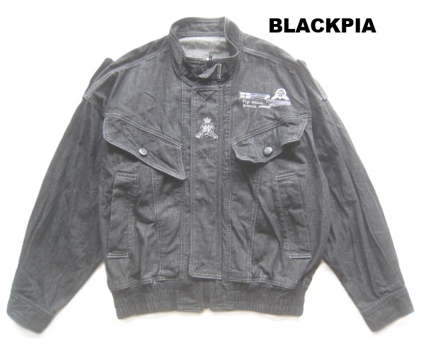 > 極上日本製!!ブラックピア BLACKPIA*定価4万 ロゴ刺繍 立ち襟ブラックデニムジャケット・Gジャン M 黒 PIASPORTS ピアスポーツ RAIKA