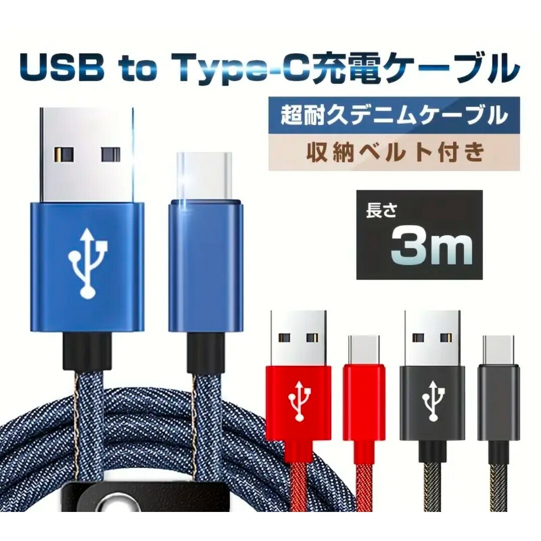 - 新品 3m 急速充電 デニム USB Type-C スマホ充電ケーブル 青
