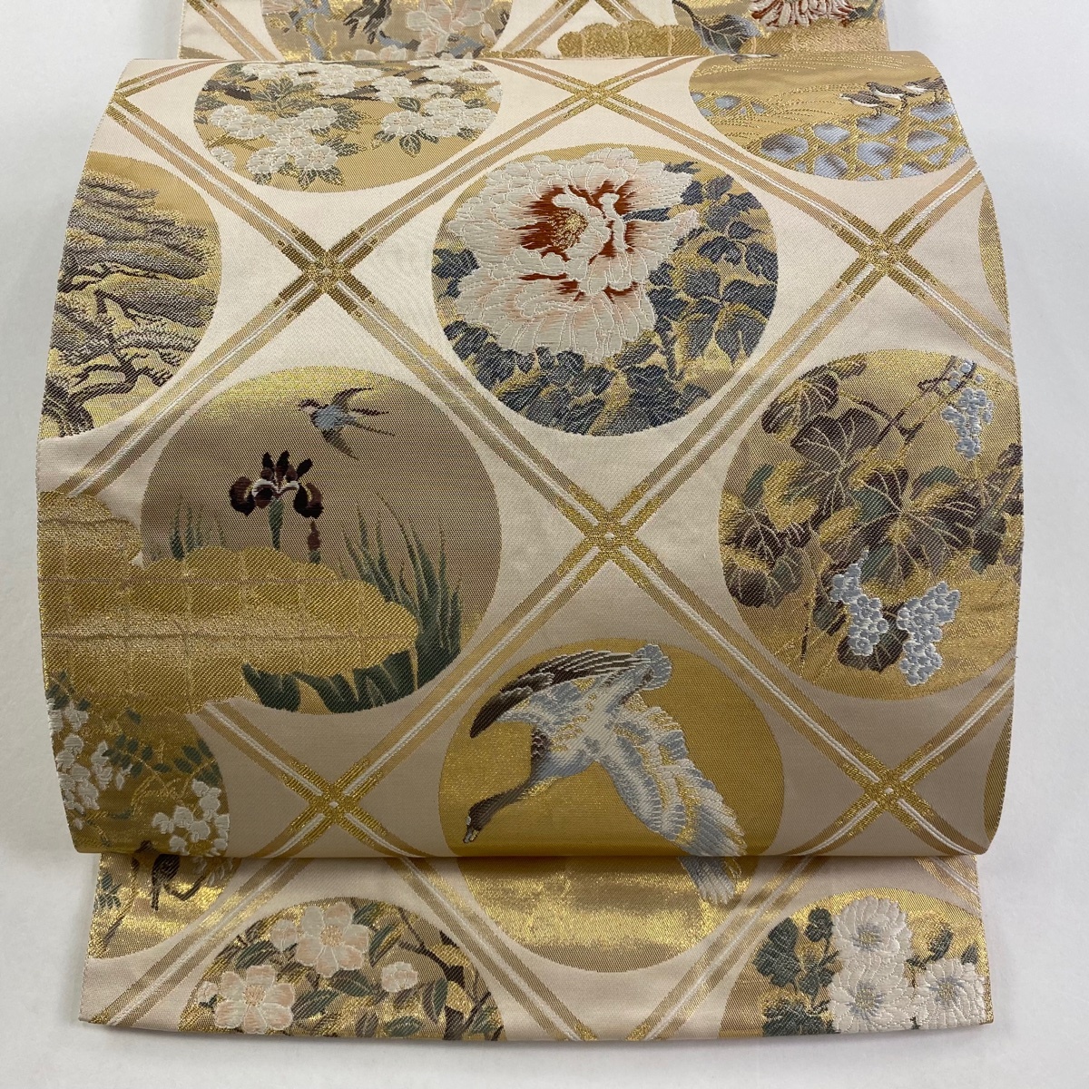 - 袋帯 秀品 花鳥 雲文 金糸 箔 金色 六通 正絹 【中古】