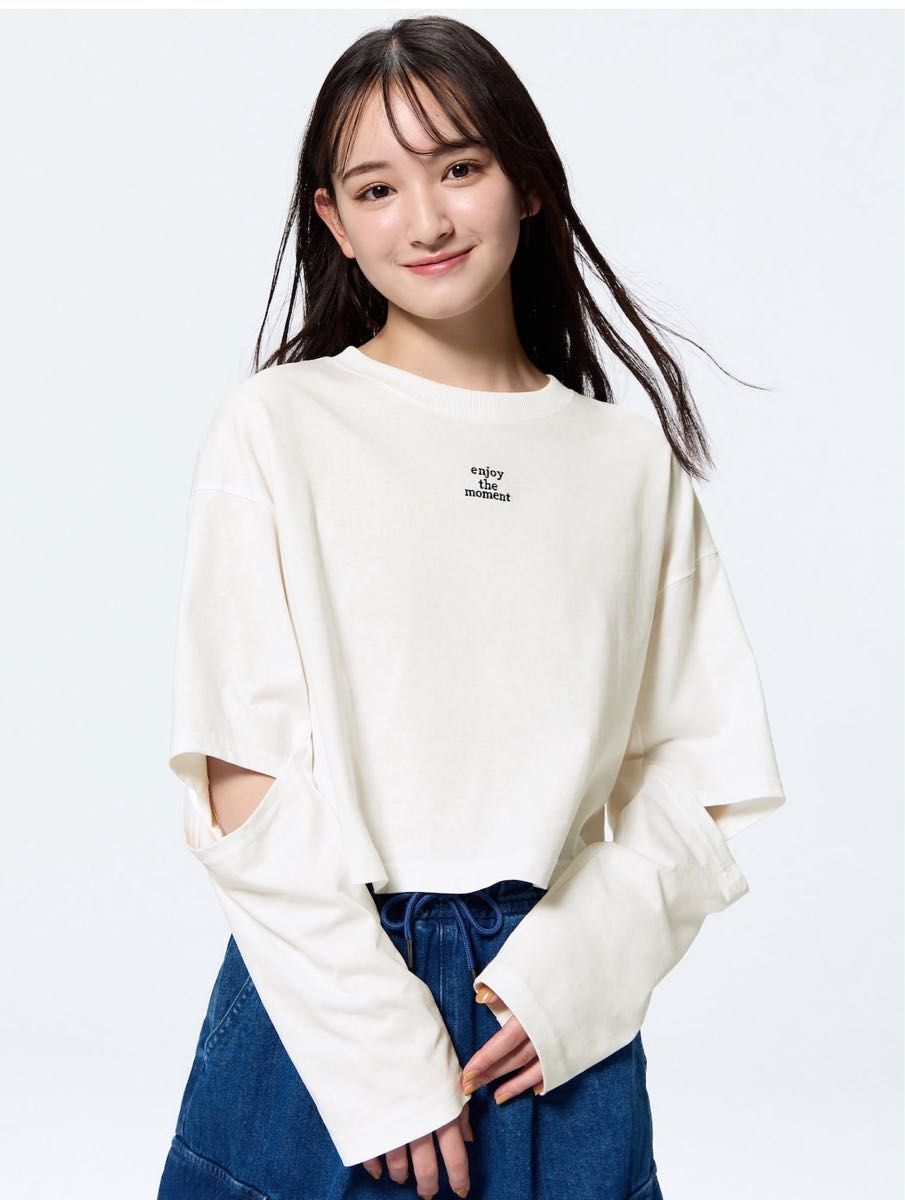 > 美品♪ [GU] GIRLS カットアウトT(長袖) OFF WHITE Lサイズ(160㎝)