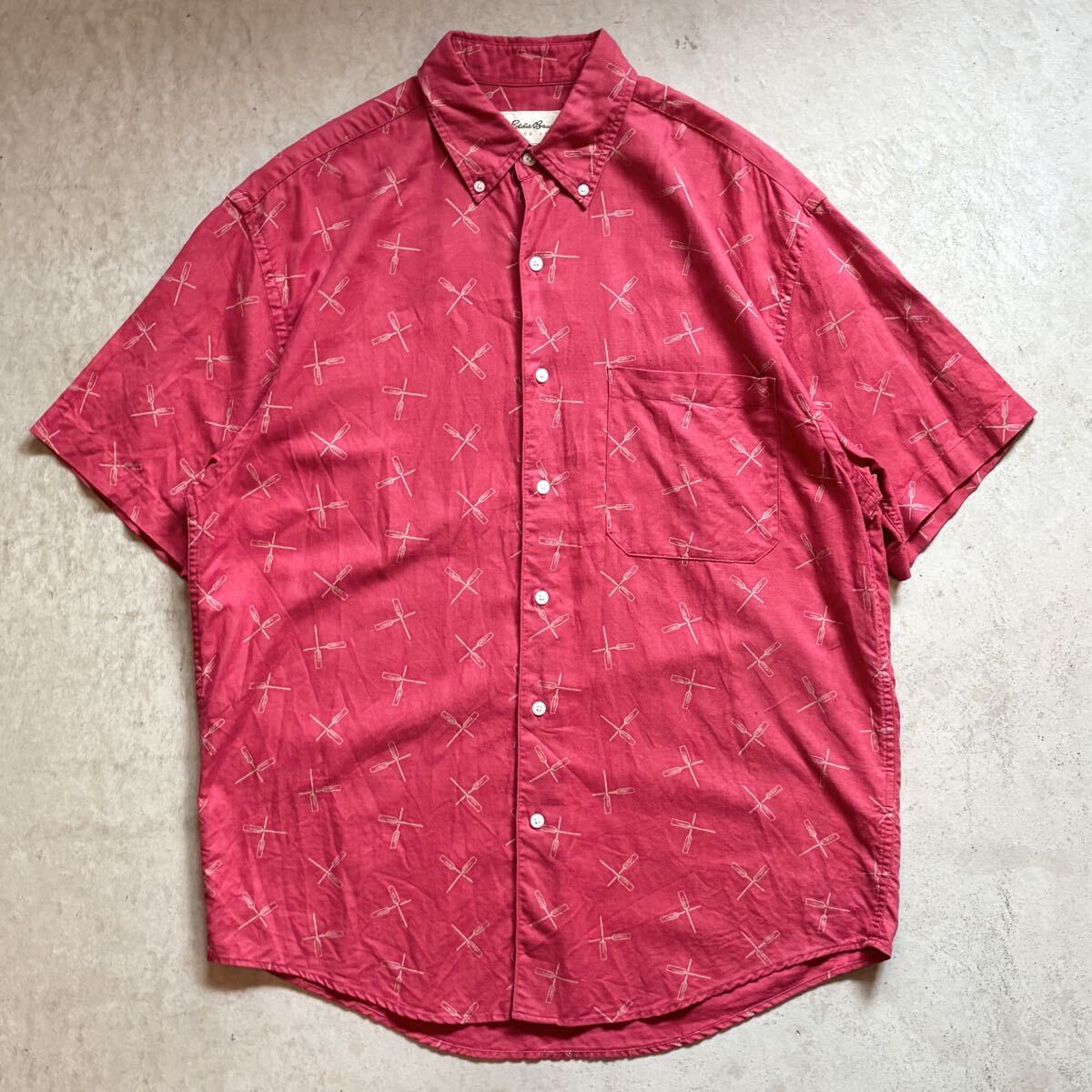> 【90s】00s Eddie Bauer エディーバウアー ボタンダウン 半袖シャツ メンズ S 赤/RED 総柄 リネン コットン 麻 アウトドア VINTAGE 正規