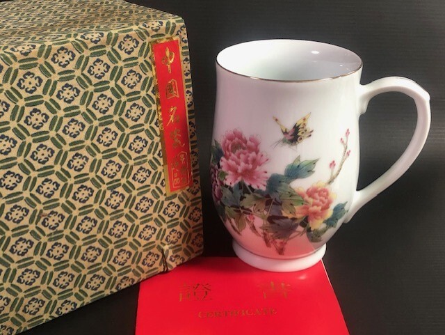 > ◎キリンビアマグコレクション 1994年 【手描き】 中国景徳鎮製 「粉彩牡丹蝶図」◎箱・証明書付z69
