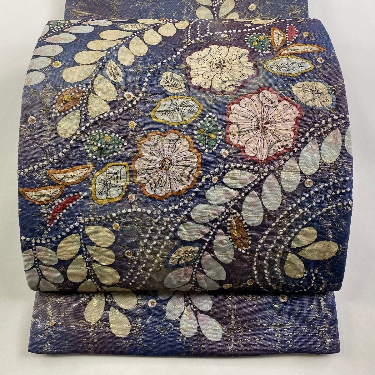 - 袋帯 美品 名品 落款 辻が花 銀糸 箔 青紫 お太鼓柄 正絹 【中古】