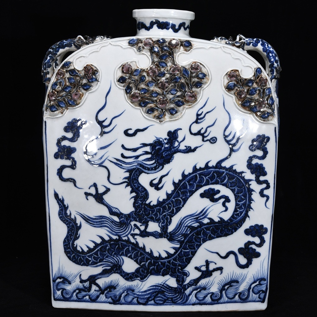 - 磁器 元時代 青花釉里紅捏花龍紋四系扁瓶・酒壺 37cm秘蔵 古陶磁器 陶芸 唐物 古賞物 時代物 骨董品古置物 極細工 中国磁器 古美味 古玩921