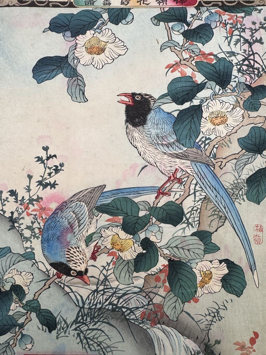 - 【真作】本物浮世絵木版画 幸野楳嶺【楳嶺花鳥画譜 沙羅花 山鵲】明治期 花鳥図 大判 錦絵 保存良い