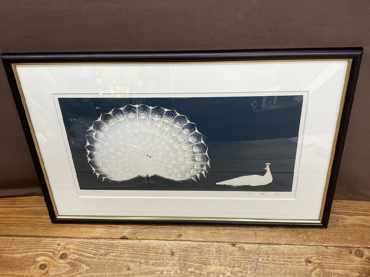 > 【JF-4020】リトグラフ 日本画家 小山硬 印度孔雀 限定 99/150 サイン熊本県出身石版画絵画 約45x70cm 東京引取可【千円市場】