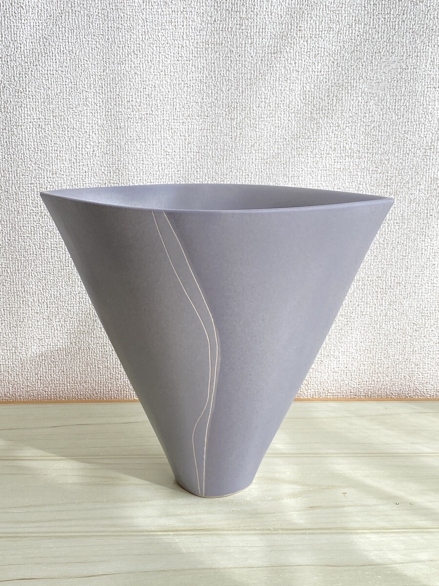 > 【KB95】陶器 花瓶 逆三角型 薄い紫 横幅24.5〜6cm 高さ約21cm 重さ約1.5kg 陶磁器 焼物 花道 華道 花器