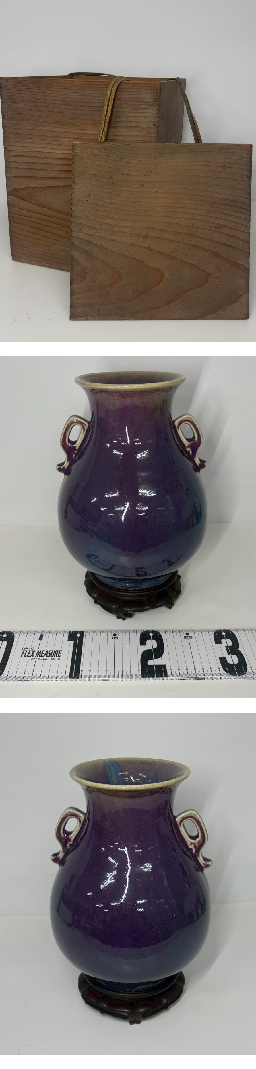 - コレクター収蔵品 辰砂 双耳壷 唐木台付 花瓶 花入 中国美術 古玩 骨董 置物 飾物 芸術 時代物 初出 華道具 長崎買取 台割れ有