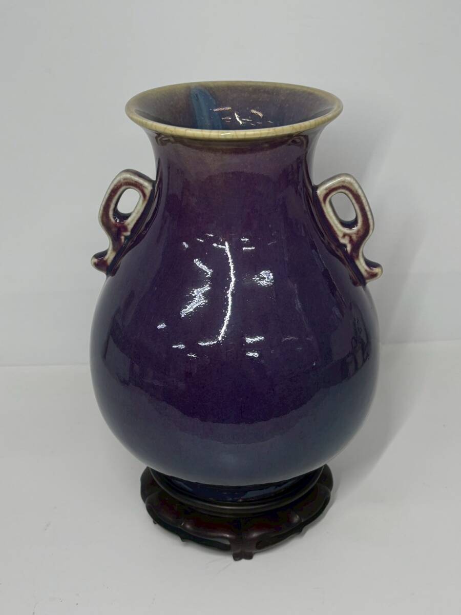 > コレクター収蔵品 辰砂 双耳壷 唐木台付 花瓶 花入 中国美術 古玩 骨董 置物 飾物 芸術 時代物 初出 華道具 長崎買取 台割れ有