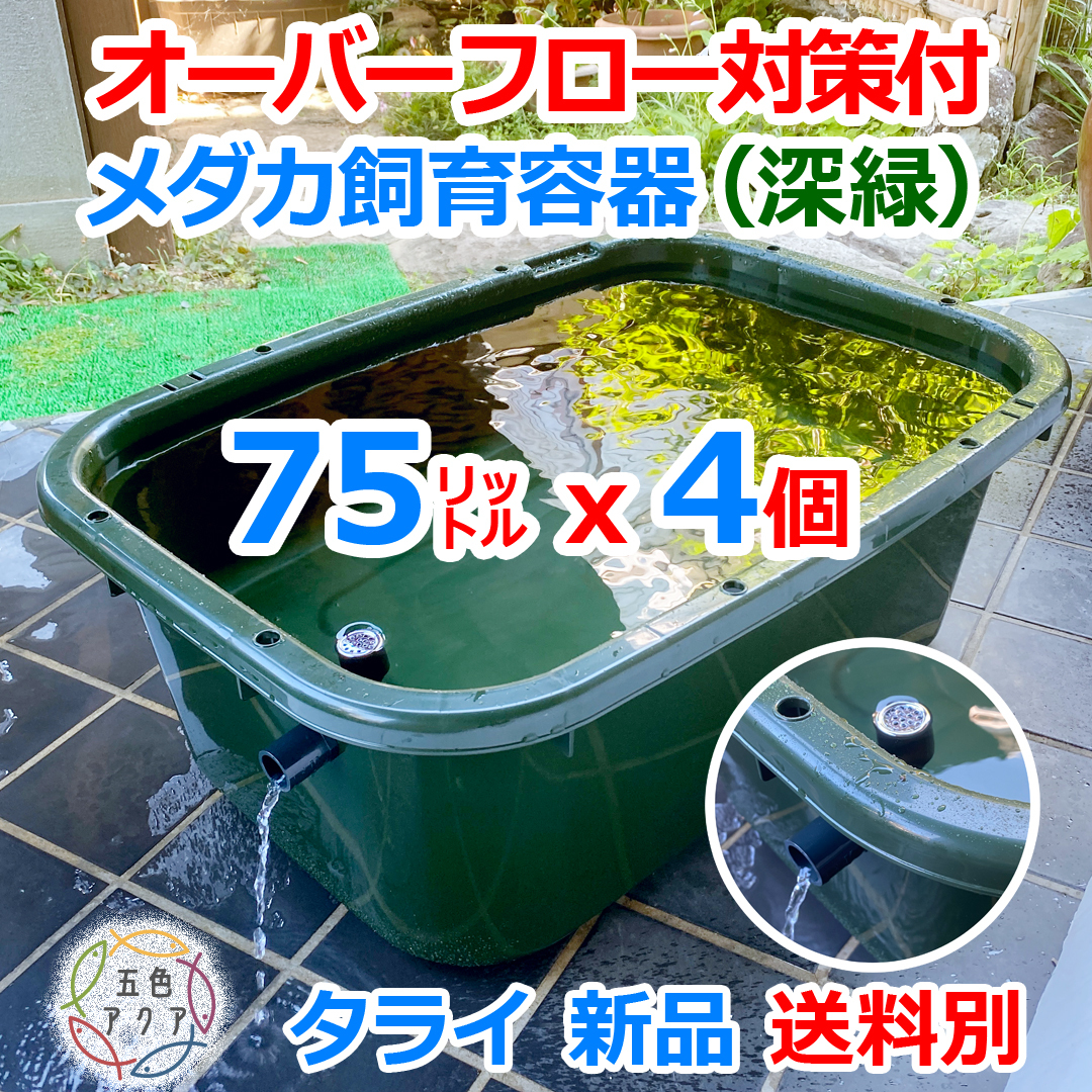 - 【新仕様】ダカ飼育容器 75㍑深緑x4個 オーバーフロー対策付 送料別 メダカ水槽 メダカ飼育ケース 金魚飼育 タライ トロ舟【五色アクア】09