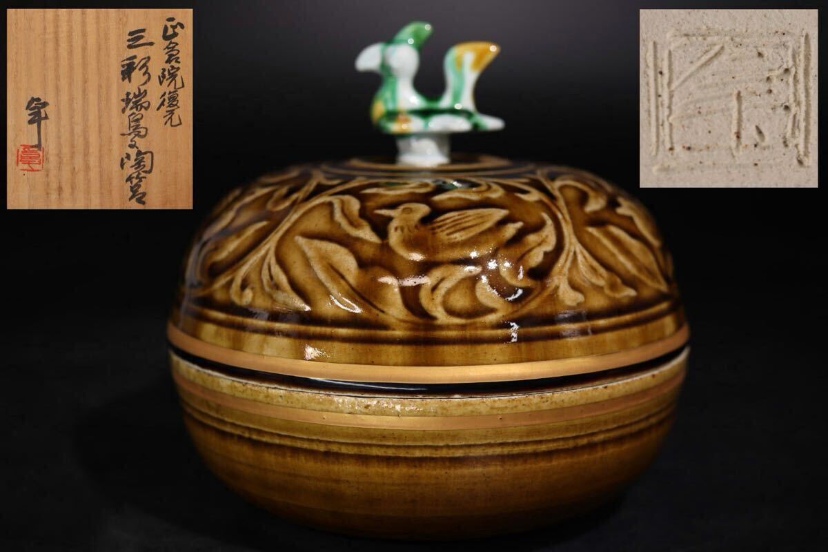 > 加藤卓男 「 正倉院 復元 三彩 瑞鳥文 陶筥 」 栞・共布・共箱付 / 人間国宝 黄釉 煎茶道具 .G2619