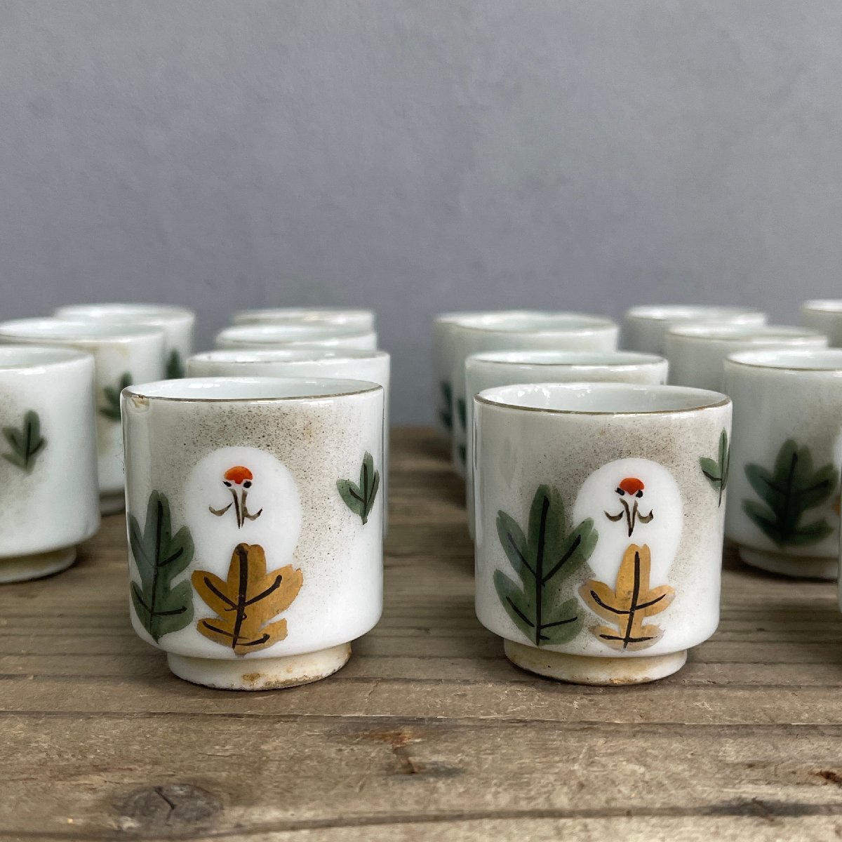 > 中古★現状品★骨董品 お猪口 20客 松 鶴 明治 祝い 金淵 木箱入り 欠け・ヒビあり(2客)