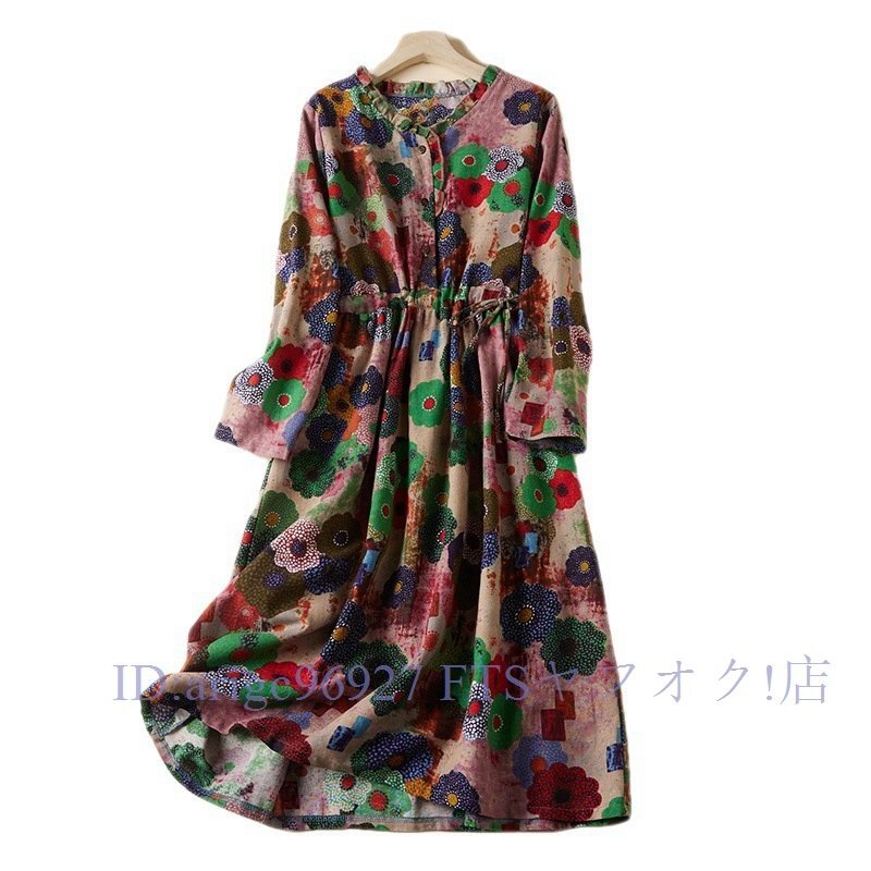 > ★新品お色選択可 カジュアル 復古風 ミモレ丈 長袖 プリント 大きいサイズ 綿麻 着痩せ オフィス 通勤 ロングワンピース M-2XLサイズ