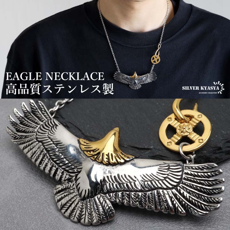 - サージカルステンレス イーグルネックレス フェザーネックレス メンズ 特大 シルバー 太陽ホイール 316L 金属アレルギー対応