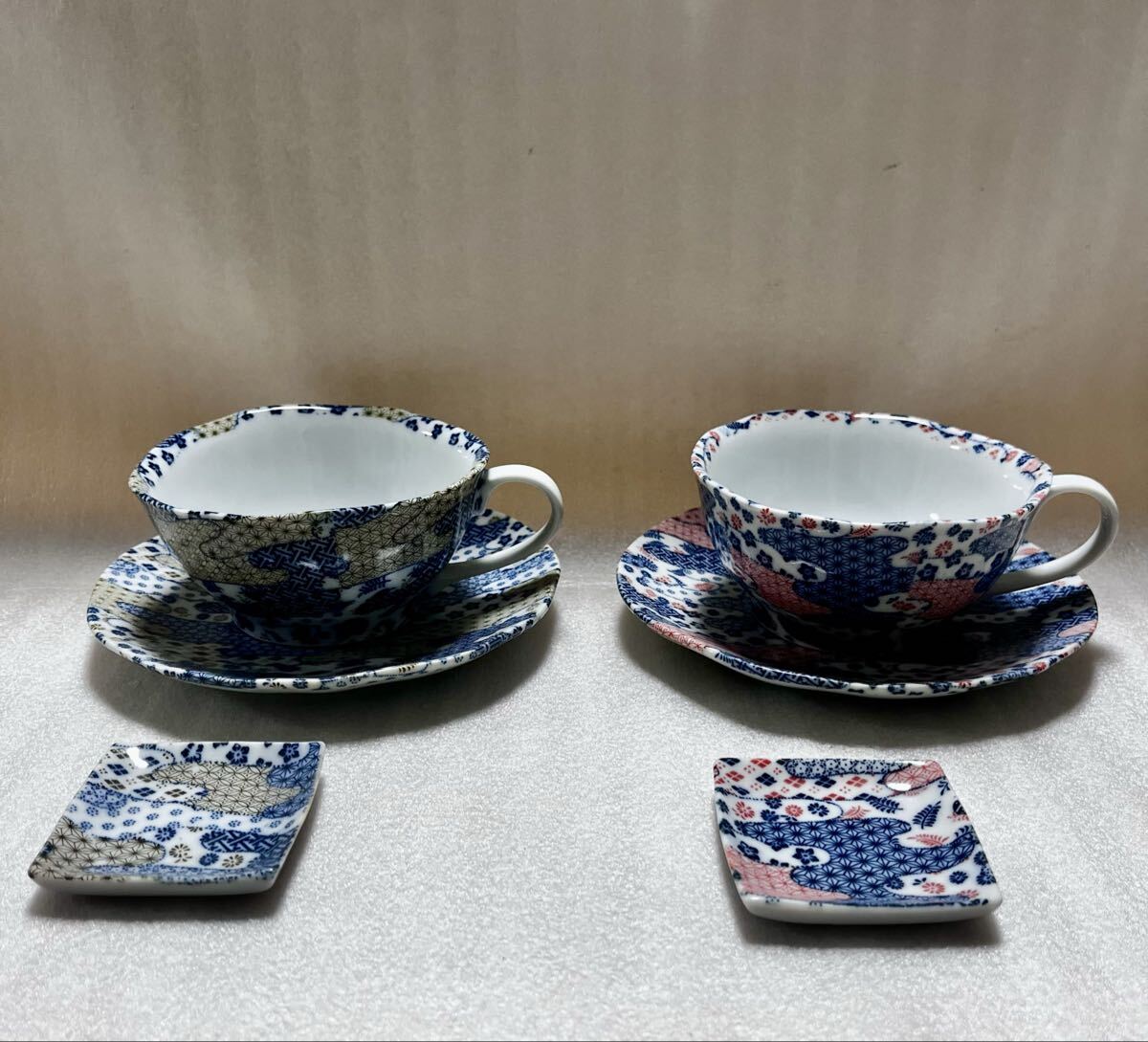 - 未使用 新品 美濃焼 敏山窯 ペア カップ ソーサー 2客 豆皿 6点 セット 和柄 花柄 赤 青 お洒落 可愛い