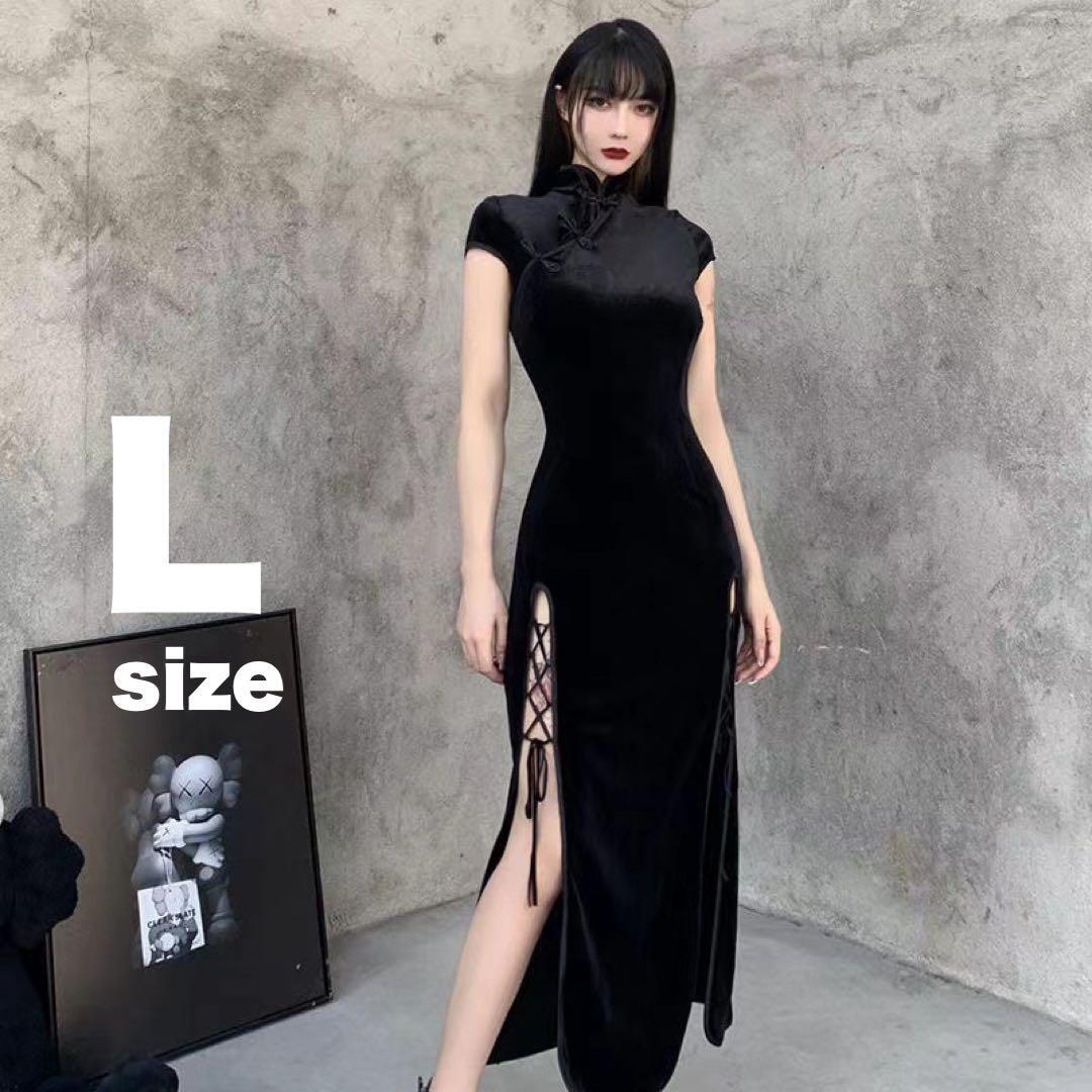 - チャイナドレス ロング 黒 L ハロウィン コスプレ 衣装 チャイナ服 仮装