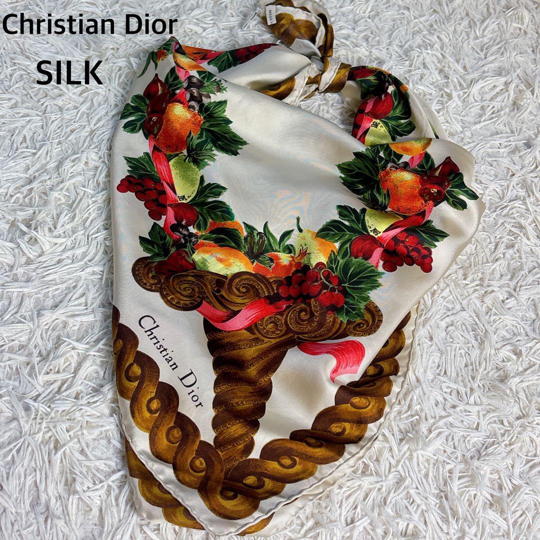 - Christian Dior クリスチャンディオール シルク SILK スカーフ 総柄 果物 フルーツ ロゴ 大判 ヴィンテージ vintage