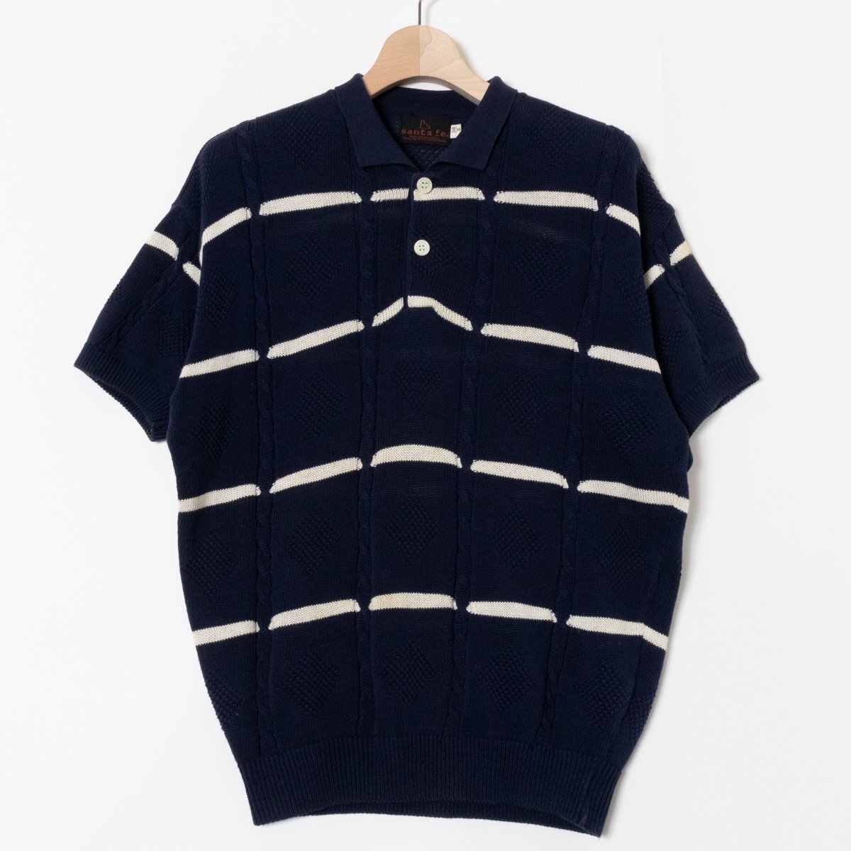 - santa fe トップス サンタフェ 半袖ポロニット ネイビー ケーブル ボーダー シンプル カジュアル 透け感 コットン混 春夏 38/2 メンズ