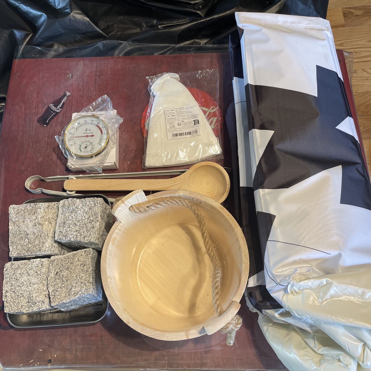 - サウナグッズ8点セット サウナハット 桶 灼 温湿度計 トング 折りたたみバスタブ径70cm サウナストーンピッコロ4個 ステンレス受皿