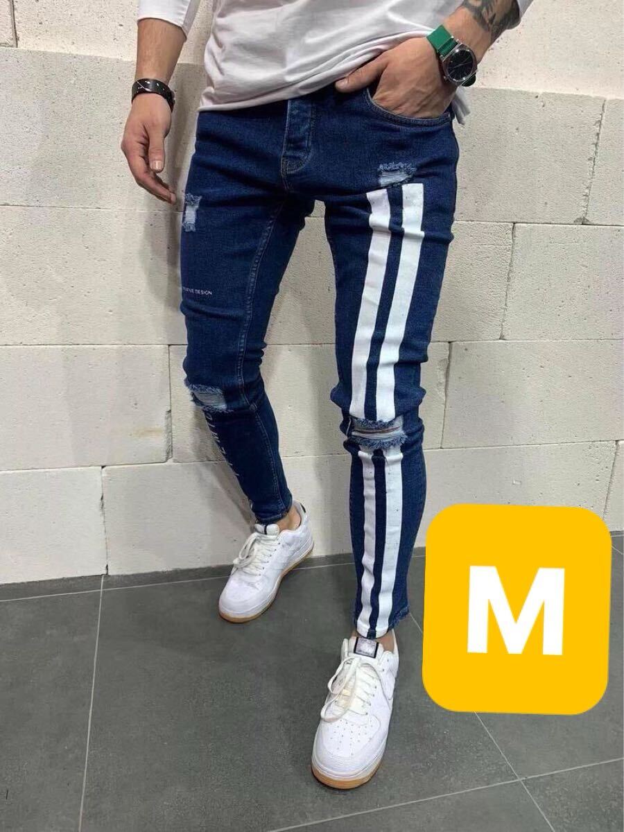 - デニム ジョガーパンツ ラインパンツ テーパードパンツ ジーンズ ボトムス スキニーパンツ ストレッチ スッキリ トレンド ブルー 青 M