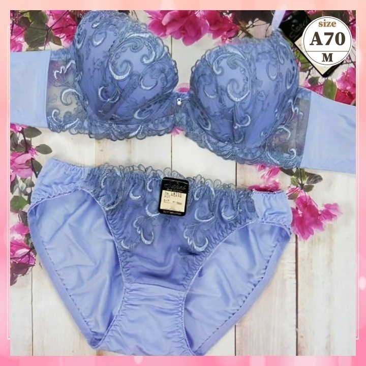 > Za7004◆新品 ブラショーツセット【A70/M】下着 ランジェリー 脇高 谷間メイク ボタニカル刺繍 青