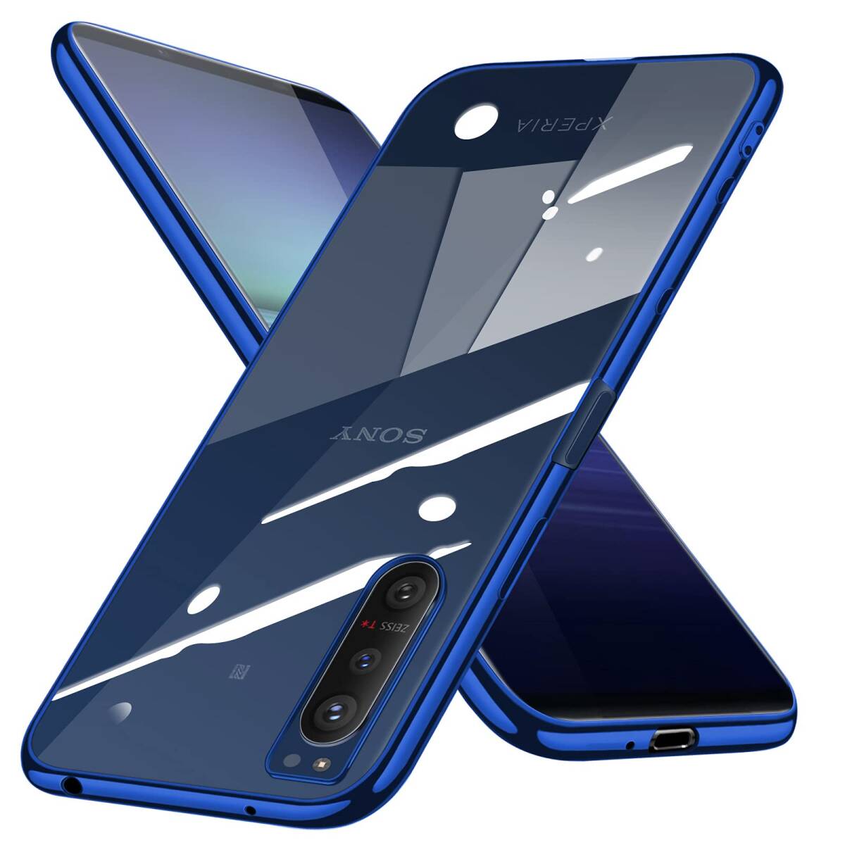- エクスペリア5 耐衝撃 軽量 背面クリア ストラップホール付き II II 青 tpu ソフト カバー 透明 スマホケース SOG