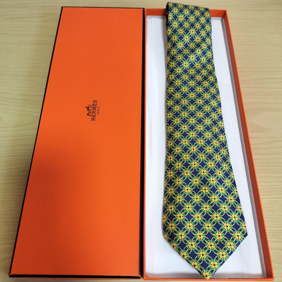 - エルメス(HERMES)青ゴールド部品チェック模様ネクタイ