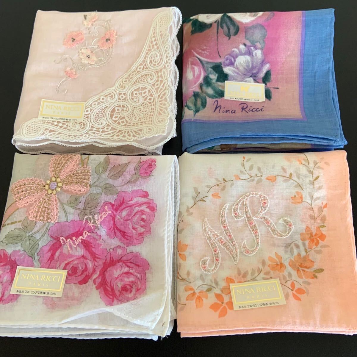 - 未使用 NINA RICCI ニナリッチ 大判ハンカチ 4枚セット 総柄 花柄 レース 刺繍 綿100% レディース ハンカチ まとめ売り