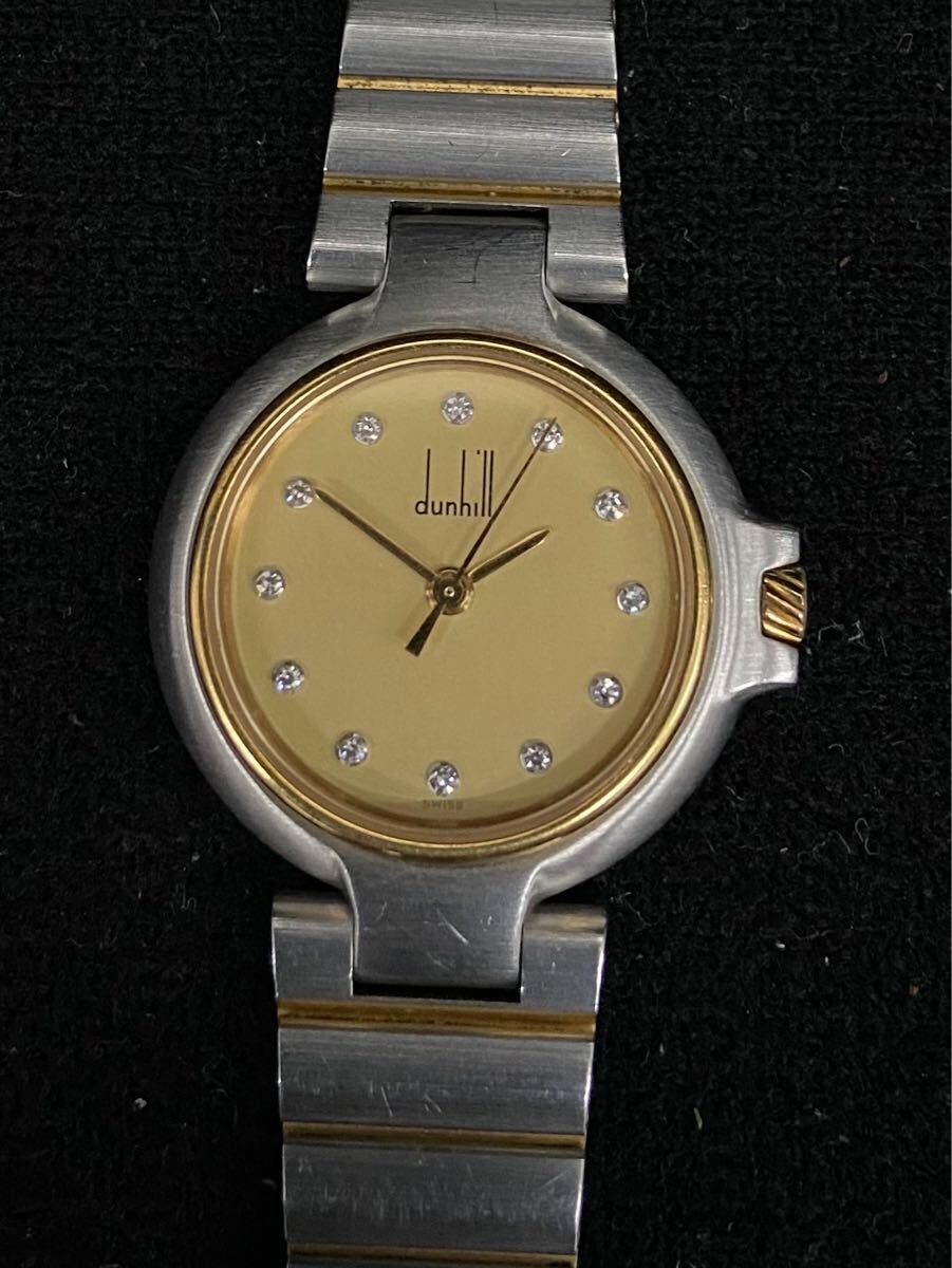> C549★Dunhill ダンヒル クォーツ 12Pダイヤ シルバー ラウンド ゴールド文字盤 レディース腕時計 新品電池交換済み 稼働品