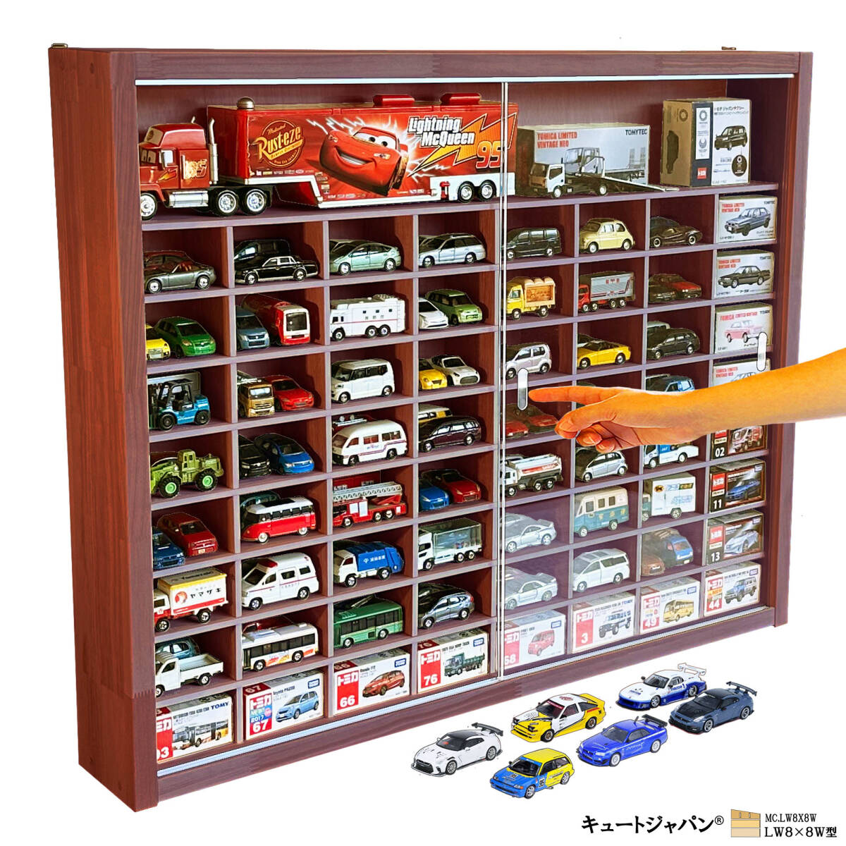 - 送料無料★木製ミニカーケース トミカ128台・大型サイズ収納 マホガニ色全塗装 アクリル障子付 日本製 LW8×8W型