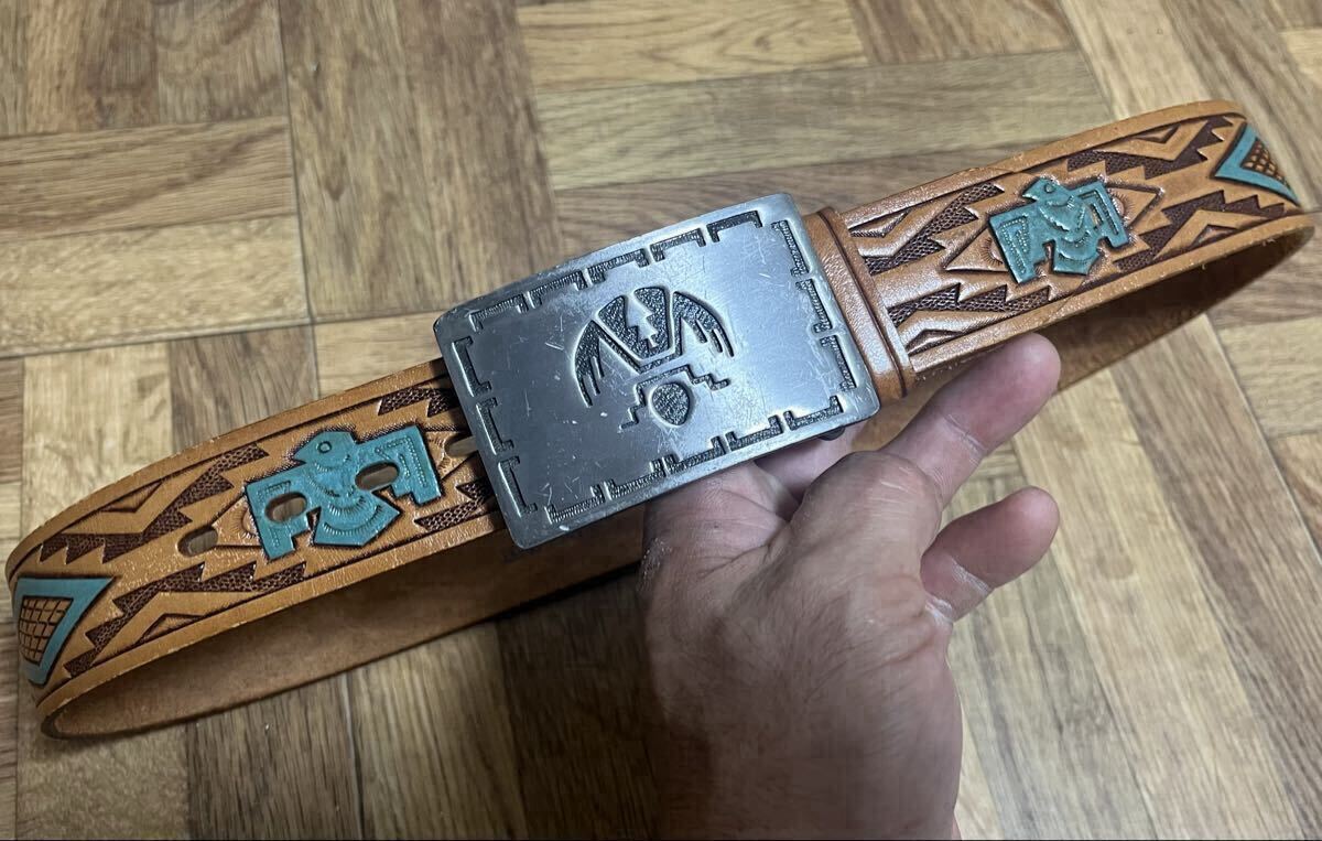 > アメリカ製 Chambers ベルト 32 茶色 サンダーバード 型押し カービング バックル 50s 60s ロカビリー ウエスタン バイカー ヴィンテージ