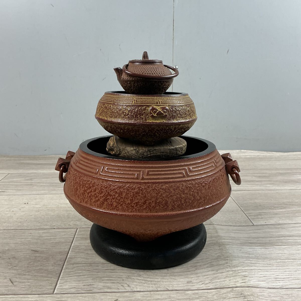 - t9366 ミニチュア火鉢 急須 3段セット売り 鉄瓶 古民具セット 鋳物 鉄器 鉄釜インテリア 置物 中古