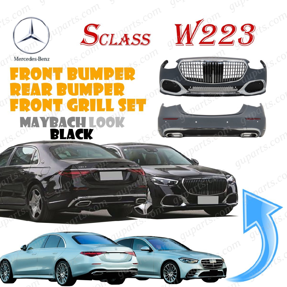 > BENZ S W223 ノーマル → マイバッハ フェイスチェンジ フロントバンパー リアバンパー グリル ブラック S400d S450d S500 S580 S580e