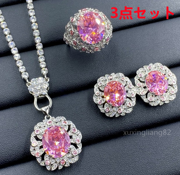 > ジュエリー3点 ピンクダイヤモンド ペンダント ネックレス リング ピアス 満々ジルコン 真の輝く メッキ アクセサリー チェーン無し