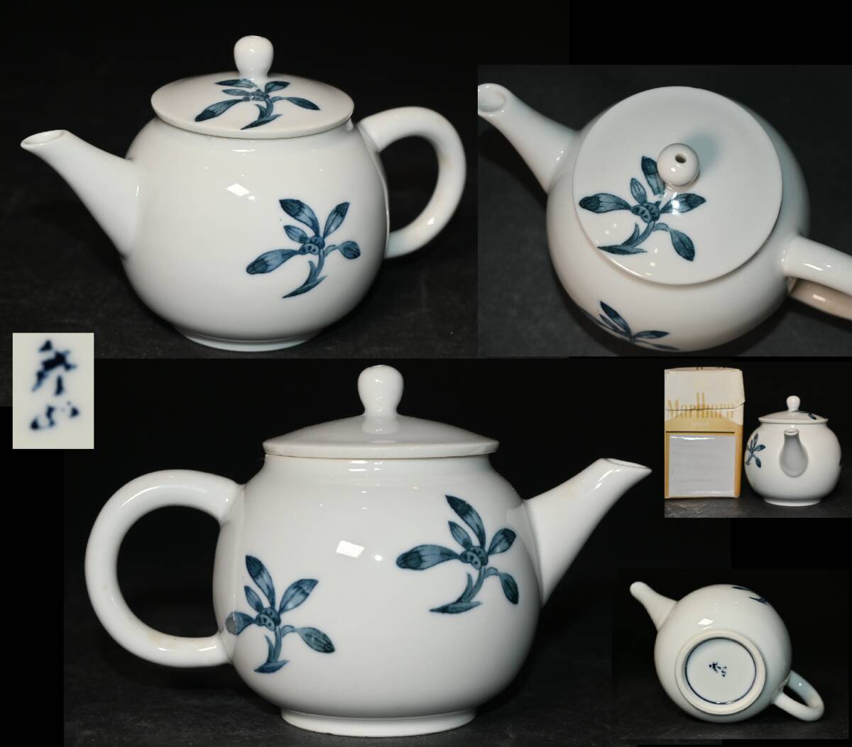 - 煎茶道具 染付 蘭文 後手急須 在銘 箱無 茶道具 茶器 茶壷 茶注 急須 白磁 検:平安
