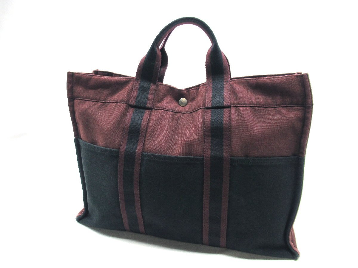 > ★【B送900円】2487 HERMES エルメス フールトゥMM トートバッグ ハンド キャンバス ボルドー×黒 フランス製 綿100%