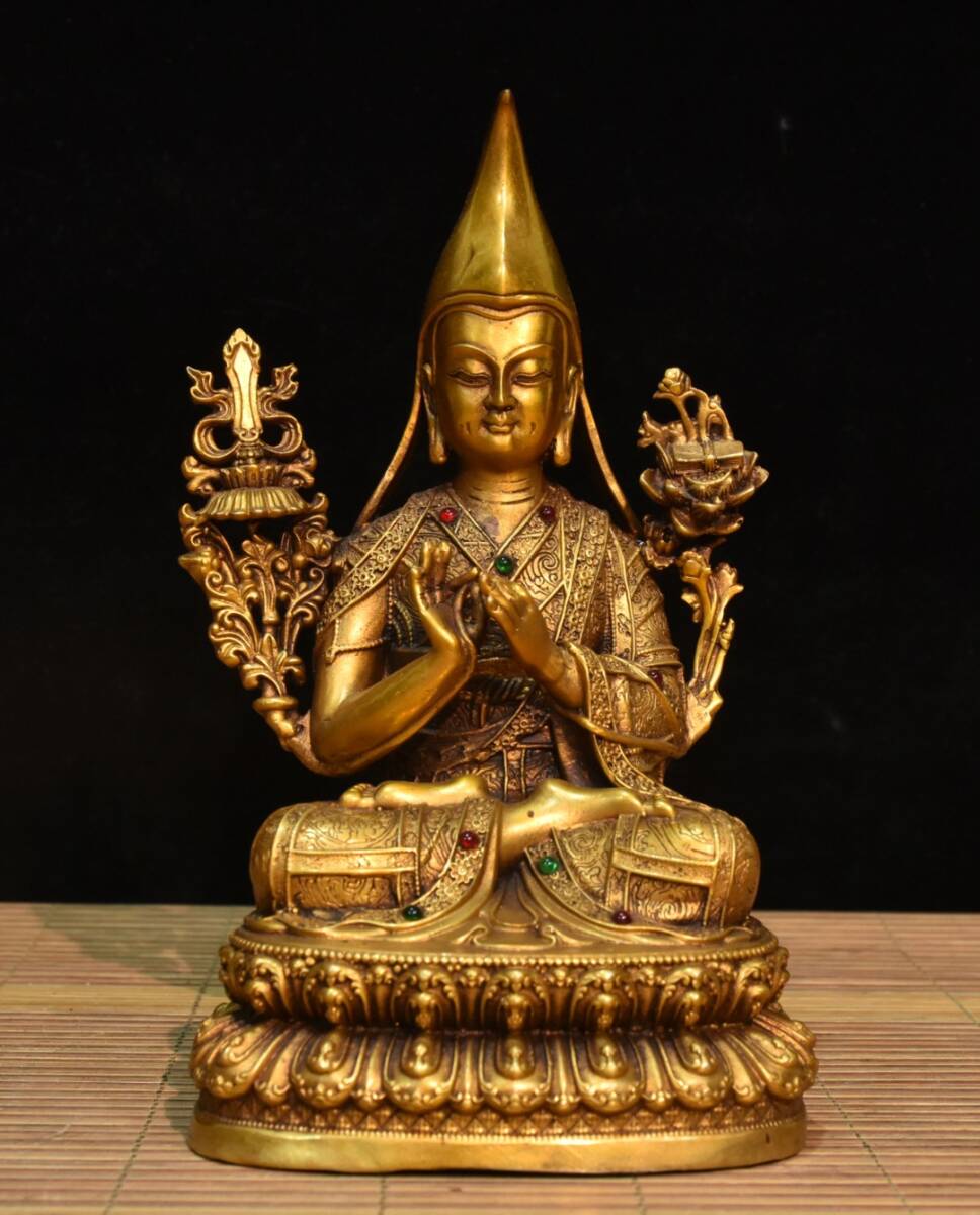 - 蔵友旧蔵出 銅製 塗金 寶石嵌 宗喀巴像 供奉仏像 希少珍品 貴重品 置物 古賞物 密宗密教 供養品 仏教美術品