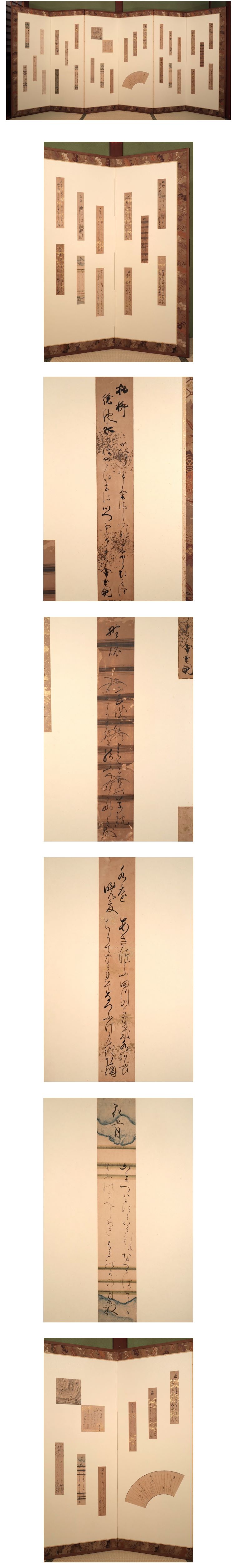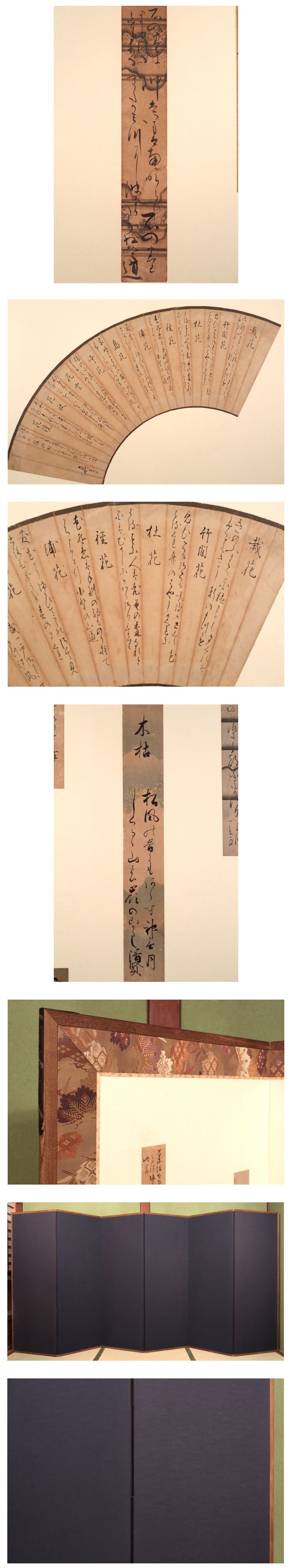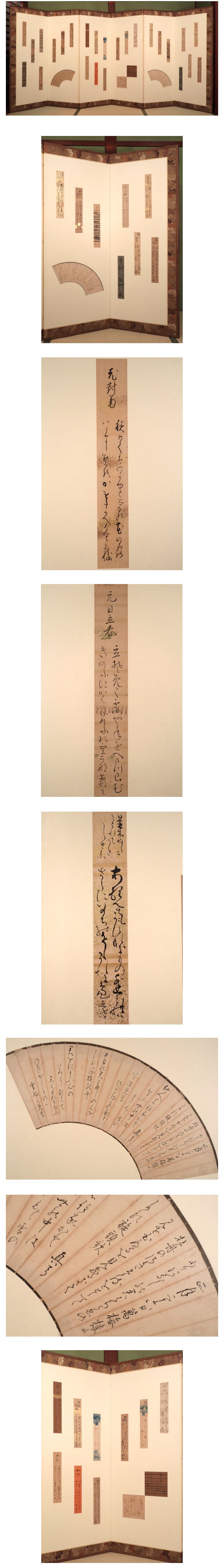 屏風をたたんだ時の大きさが、約56.5x150x11cm、6曲1双、短冊、色紙は紙本です。