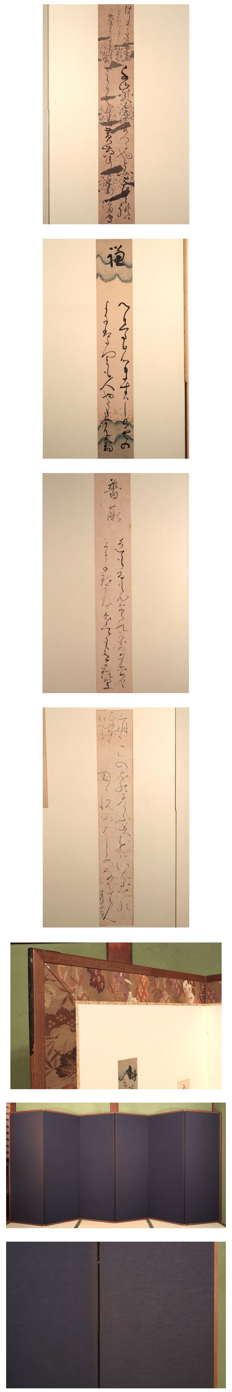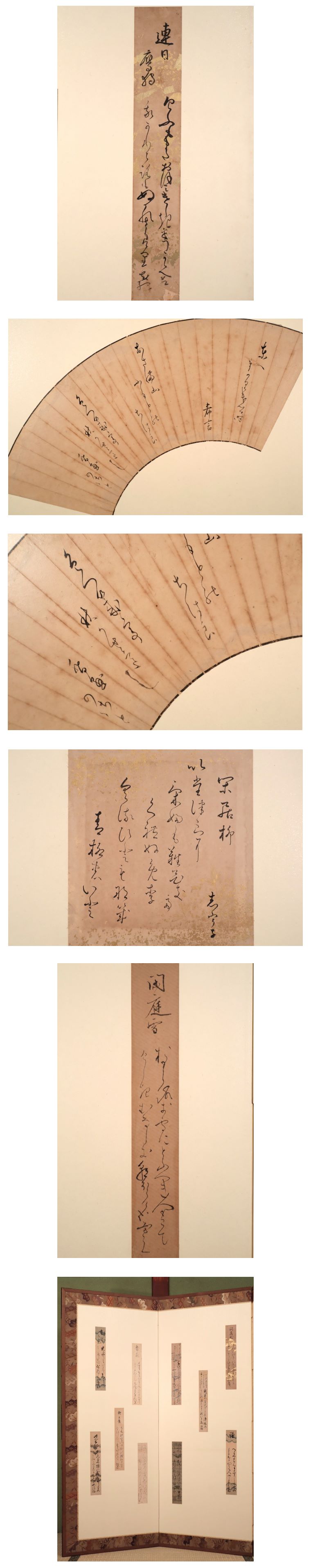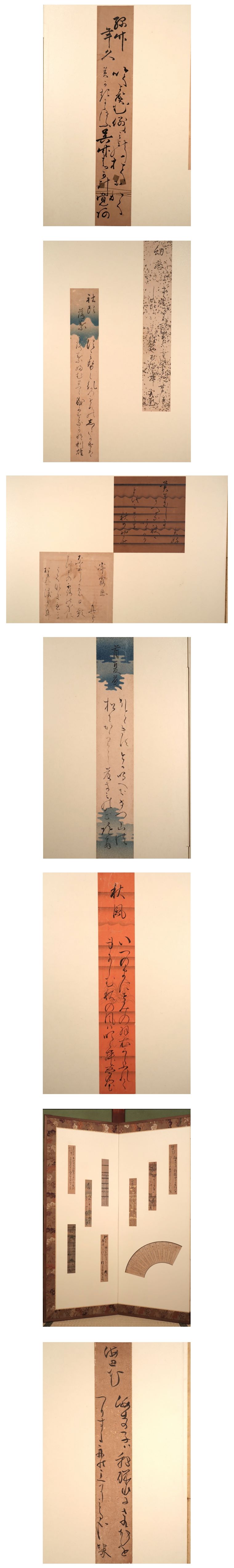 屏風をたたんだ時の大きさが、約56.5x150x11cm、6曲1双、短冊、色紙は紙本です。