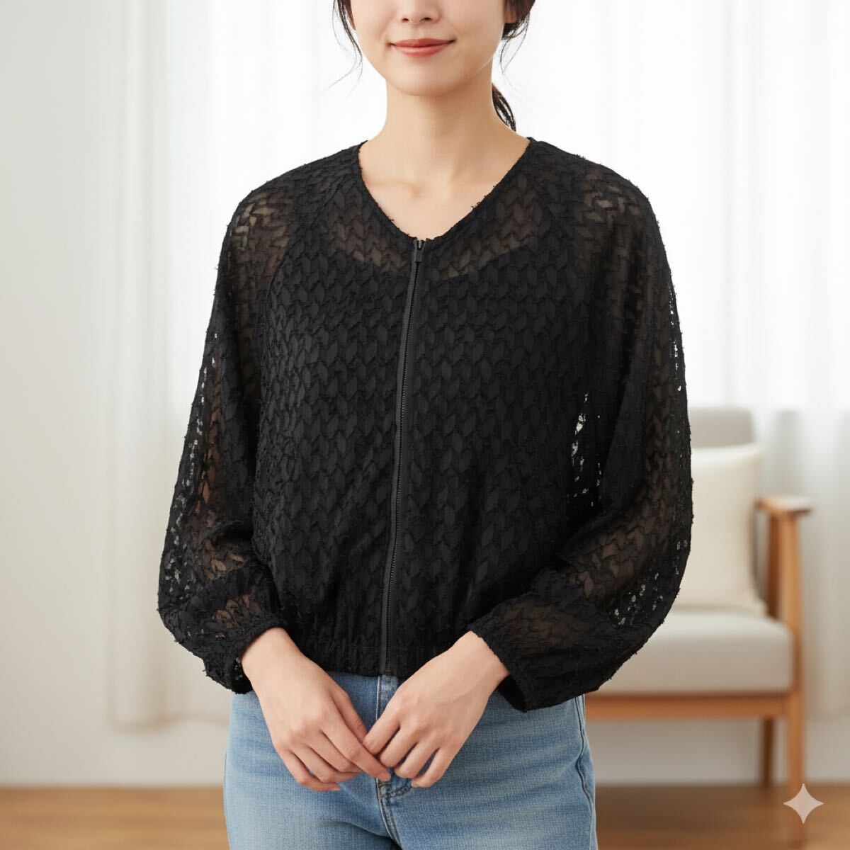 - ザラ ぽこぽこ シャツ フルジップアップ 長袖 透け感 ブラック レディース L