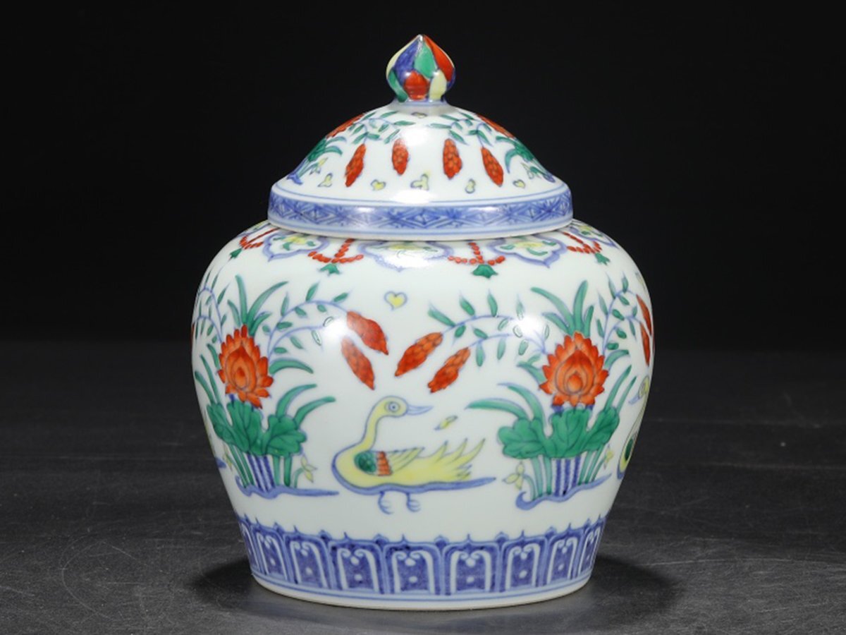 - 【安】明時代 大明成化年製 斗彩荷塘清趣紋天字蓋罐 共箱 唐瓷 古陶瓷 古美味 中国古美術 古董品 207