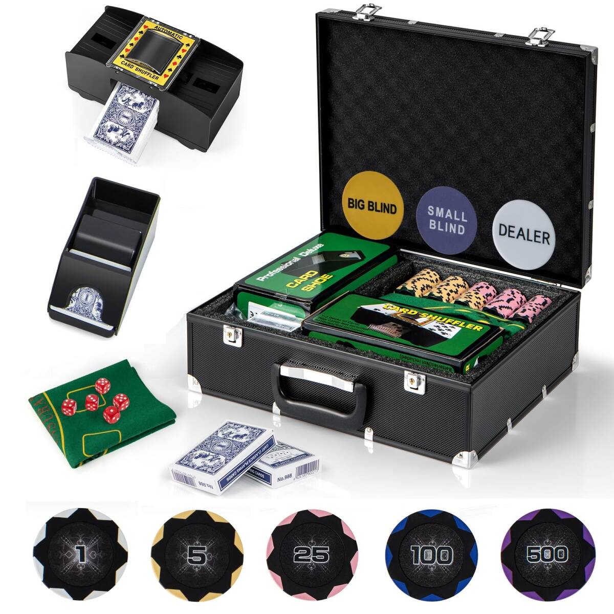 - ト&ランプ&サイコロ&マット付き ブラックケース&カードシュー&カードシャッフラー カジノセット (ブラック300枚数字14g)
