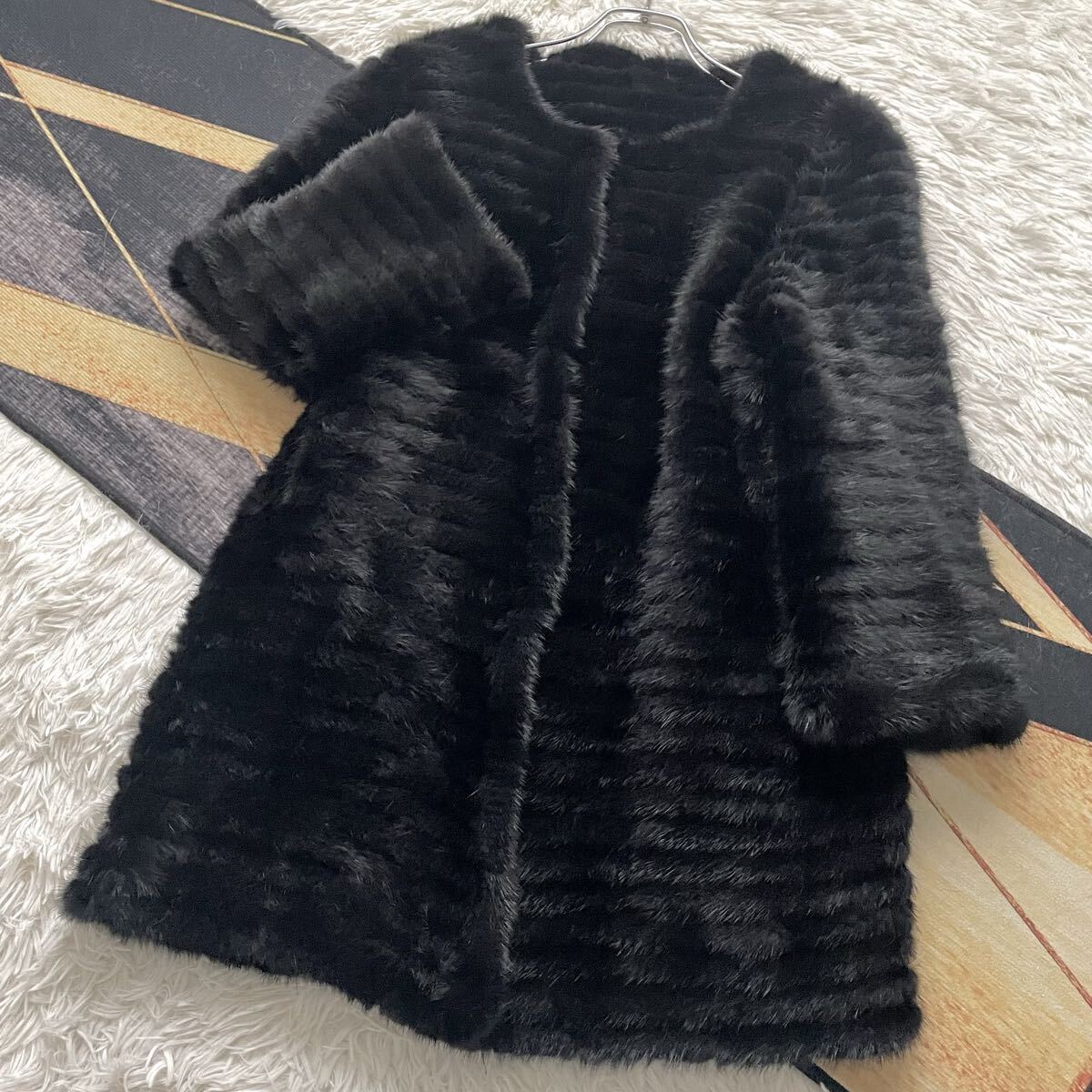 > ツヤツヤ◎/人気モデル 近年デザイン/横段 ミンク 軽量 毛皮 ファーコート 貂 MINK リアルファー L-XL 上質毛並み◎ アウター ブラック/黒