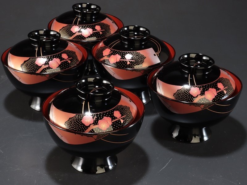 ■【夢讃岐】越前塗 蒔絵 吸物椀 5客揃(蓋5枚)Φ130 H80 wa969 ■ 商品詳細 御覧頂き、ありがとうございます。 【夢讃岐】越前塗 蒔絵 吸物椀 5客揃(蓋5枚)Φ130 H80 wa969 ○商品状態○経年あります。椀5客揃(蓋5枚)。素地は木粉と樹脂の合成品。 状態に関しては,充分に画像で確認の上、クレームの無い様に御入札下さい。 ○サイズ○ Φ--mm/高さ--mm ぐらい画像参照ください。 ○御一読下さい○2025年で、昭和100年です。私共の扱う品は、大半の物が半世紀から一世紀以前の品です。 新品と表記しない限り,確実に経年有りますので, 新品とは違い、擦れアタリ等は有るとお考え下さい。 また細かい見落とし等も時代古物とお考えの上御容赦下さい。 気になる箇所は、画像にもアップ致しますので、ご了承の上御入札下さい。 記載・画像掲載されてない,見落としに関しては、常識の範囲で誠意対応致します。 他にも漆器をメインに出品しておりますので、ぜひ御覧下さい 。