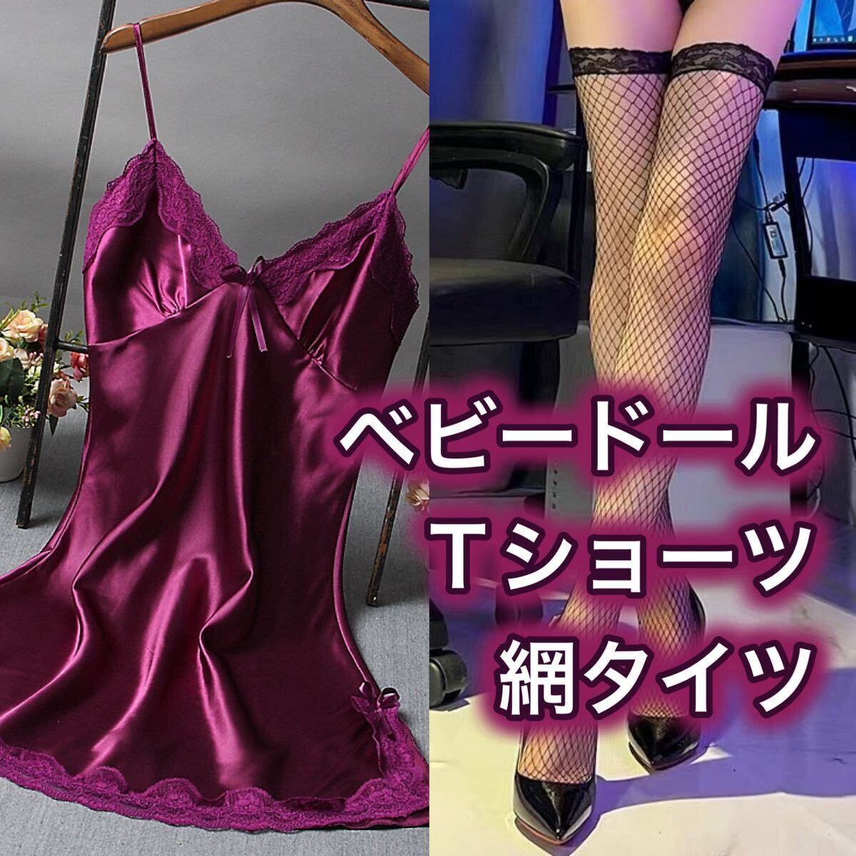 - ベビードール Tバックショーツ 網タイツ 編みタイツ パープル 紫 ブラック 黒 フリーサイズ セクシー ランジェリー M L LL XL